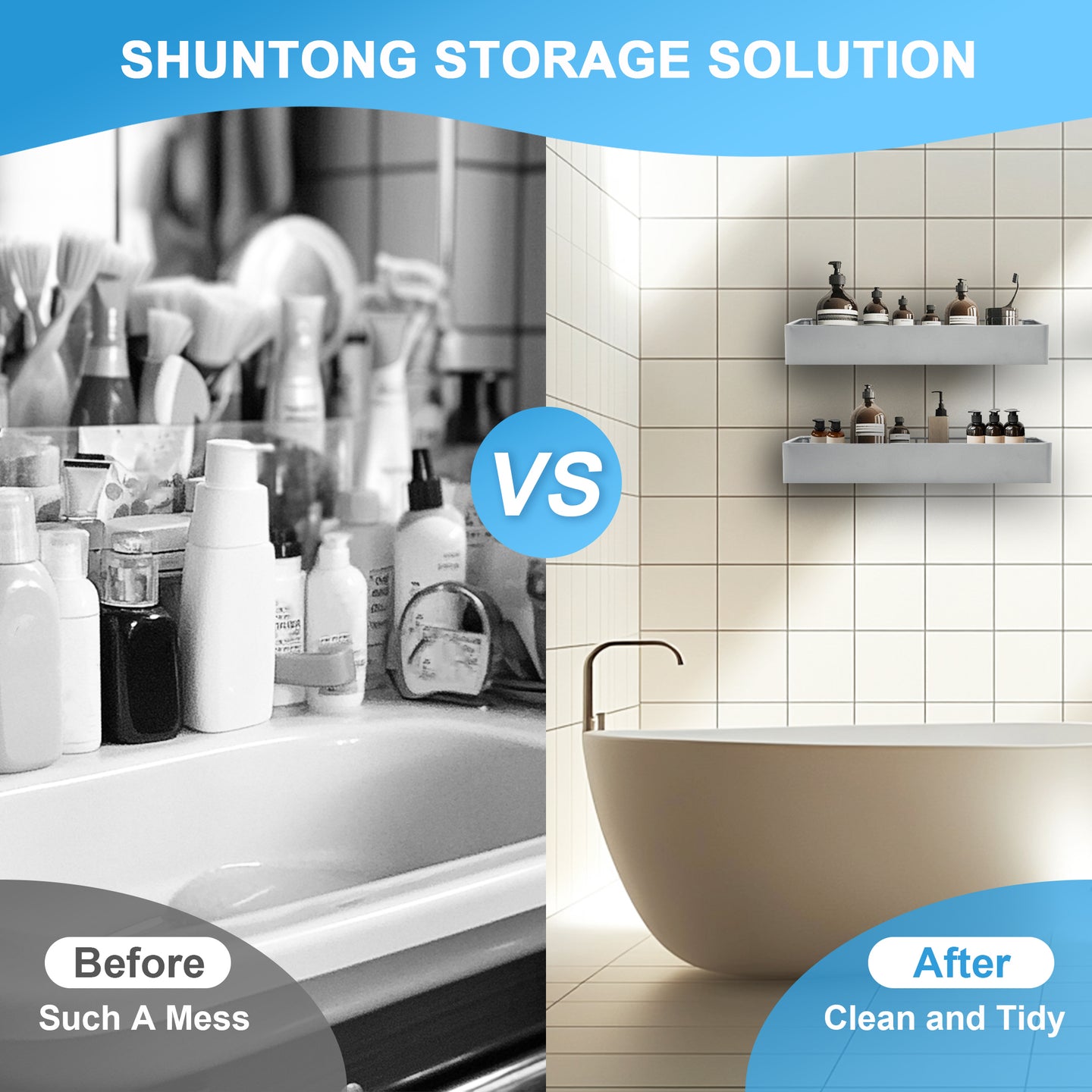 - EASY INSTALLATION, NO DRILLING REQUIRED: Forget about drilling holes or using screws! Shuntong’s drill-free installation is quick and simple. Just apply the strong adhesive tapes to smooth, sturdy surfaces, and you're done! The tapes are easily removable, and if you ever need to reposition your caddy, simply heat the adhesive with a hair dryer for 5 minutes and peel it off without damaging your walls. (Note: Please install on smooth, flat surfaces for best results.