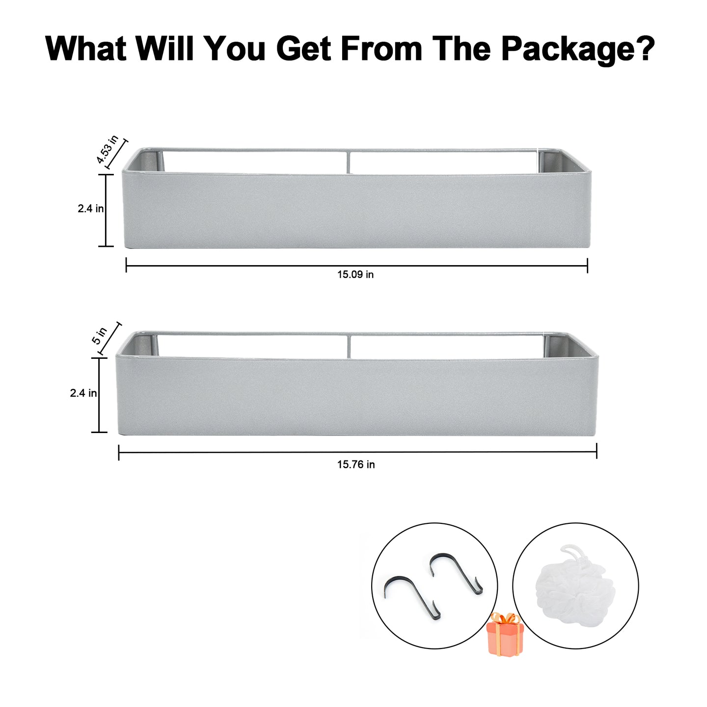 Package B:2 x shelves and 4 hooks+1 x soap holder+1 x white bath sponge