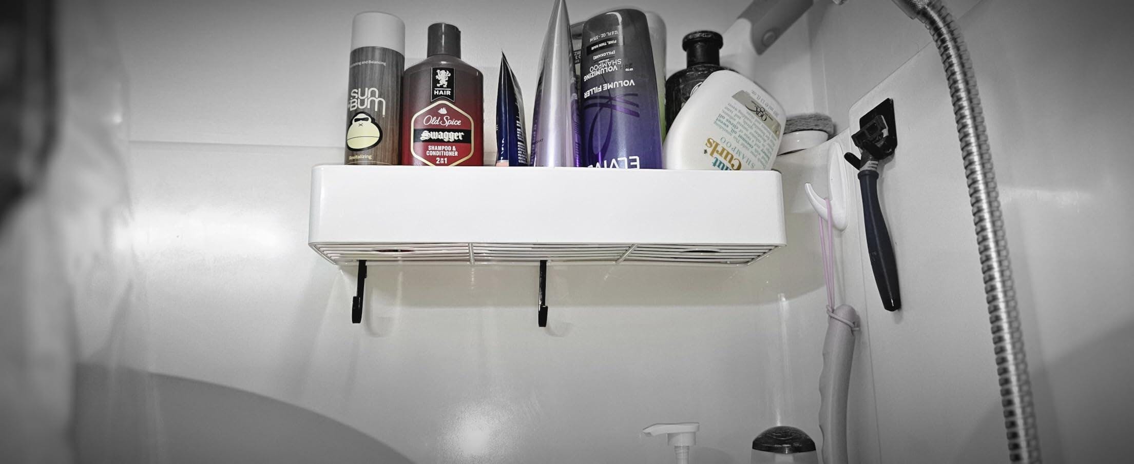 Large quality looking shower shelves. Rust proof with nice smooth finish. Holds large, heavy bottles and more securely. Lots of ventilation from bottom and back. Bottom grate made to hold bottles upside down resulting in less waste of your products. Simple, simple installation. Adhesive mounting is great option for renters. I did not have to reposition my shelves but it says you can easily REPOSITION them by using a hair dryer for 5 minutes to soften adhesive strips without damaging the wall. However it is not clear if the same adhesive can be reused to remount the shelf if removed after some time,( ie moving or storing them). It comes with 6 adhesives. 3 for each shelf. I do recommend using all 3 on each especially if you will be pushing the weight capacity for the shelves. I am happy with these shelves at the price